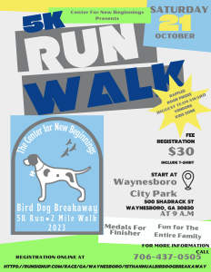 It’s time for our 16th annual Bird Dog Breakaway 5K Race/Walk!! Registration is open now! Sign up to walk, run, or just come have some fun with us on October 21, 2023.
